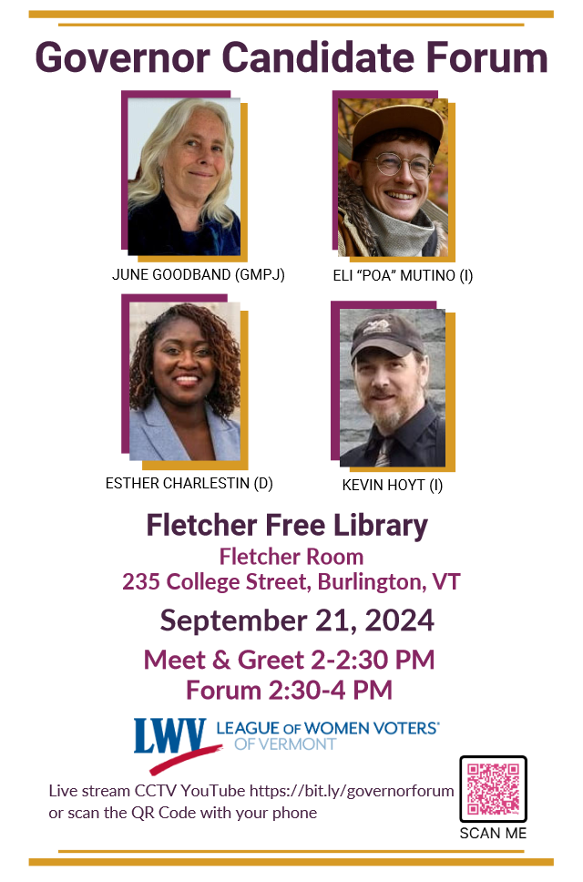 Meet the candidates running for Governor in the November 5 General Election – Esther Charlestin (Democratic), June Goodband (Green Mountain Peace and Justice), and Kevin Hoyt and Eli “Poa” Mutino (Independents). An invitation was issued to Governor Phil Scott (Republican), however, he will not be attending. Tom McKone, former Executive Director of Kellogg-Hubbard Library, will serve as moderator.
