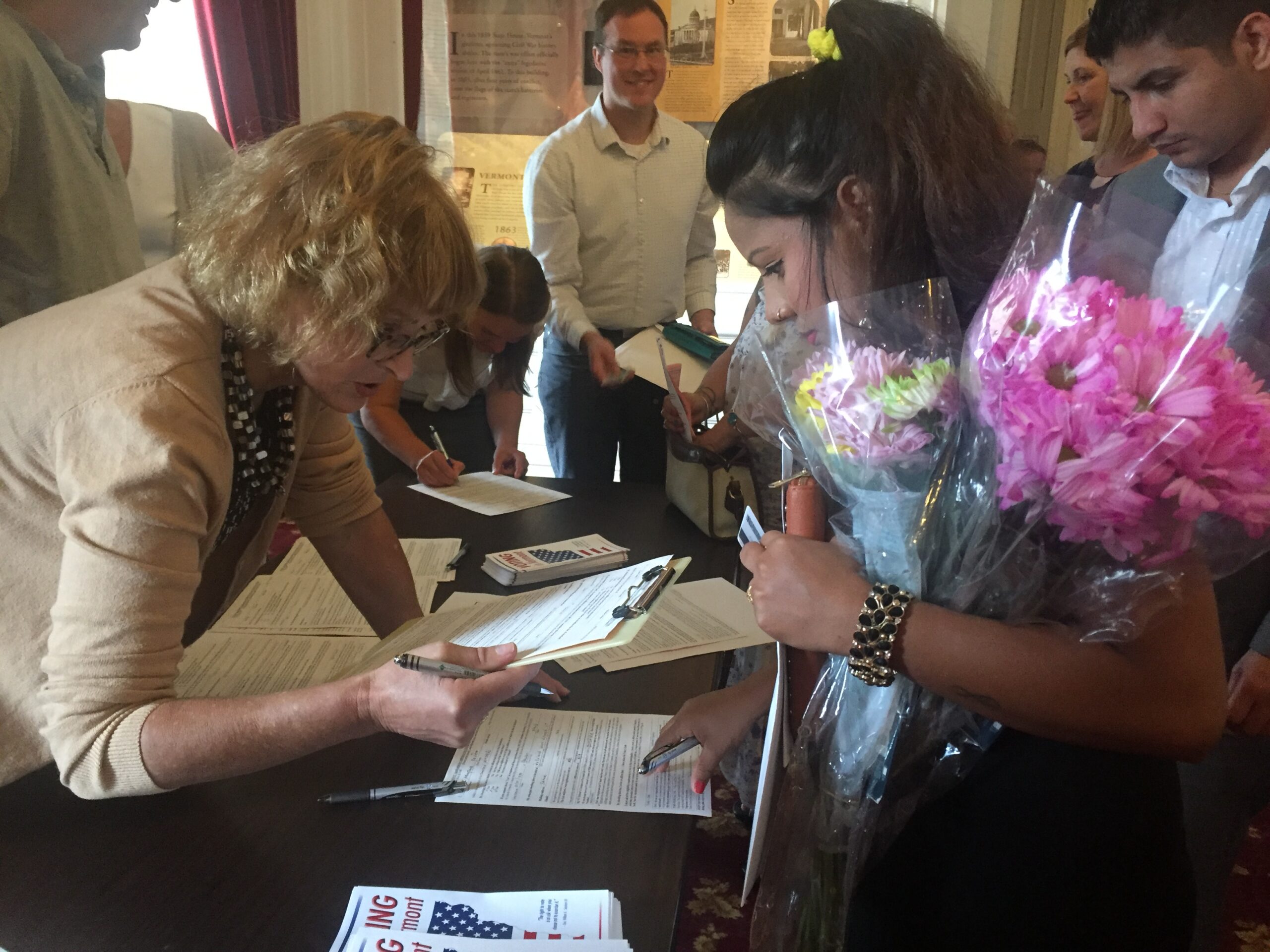 Immigrants from a multitude of countries take the Oath of Allegiance and become American citizens at a judicial ceremony hosted by the U.S. Citizenship and Immigration Services (USCIS). The League of Women Voters of Vermont plays a pivotal role registering new citizens to vote following the Naturalization Ceremony.