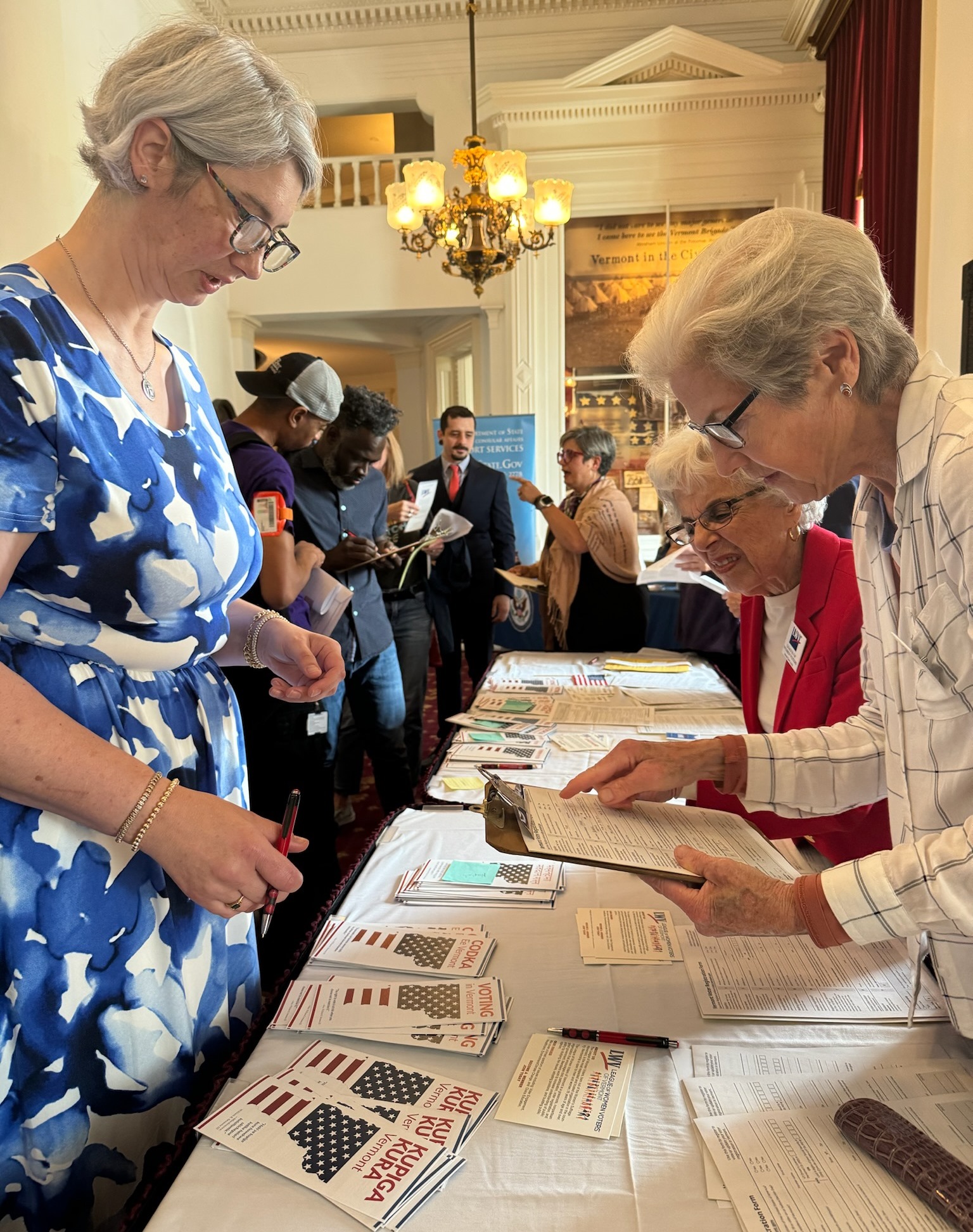 Immigrants from a multitude of countries take the Oath of Allegiance and become American citizens at a judicial ceremony hosted by the U.S. Citizenship and Immigration Services (USCIS). The League of Women Voters of Vermont plays a pivotal role registering new citizens to vote following the Naturalization Ceremony.