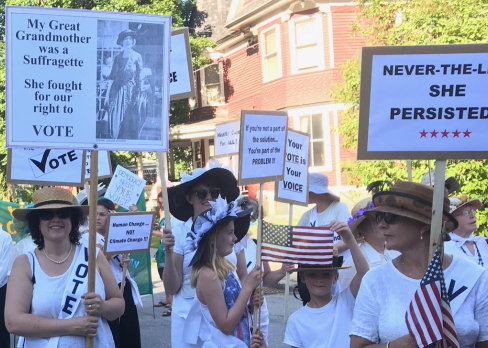 Plan and recruit folks to march in the League’s biggest community awareness event, the July 3 Montpelier Independence Day Parade. Festively dressed in the fashion of suffrage – broad-brimmed flowery hats, white tops draped with VOTE sashes, and black skirts/pants – marchers ring cowbells, twirl windsocks, wave and smile to the crowds amidst spontaneous dancing. This fun, crowd-pleaser is one to sign up for! Planning begins in June. Email Chris Abrams, Parade Coordinator.